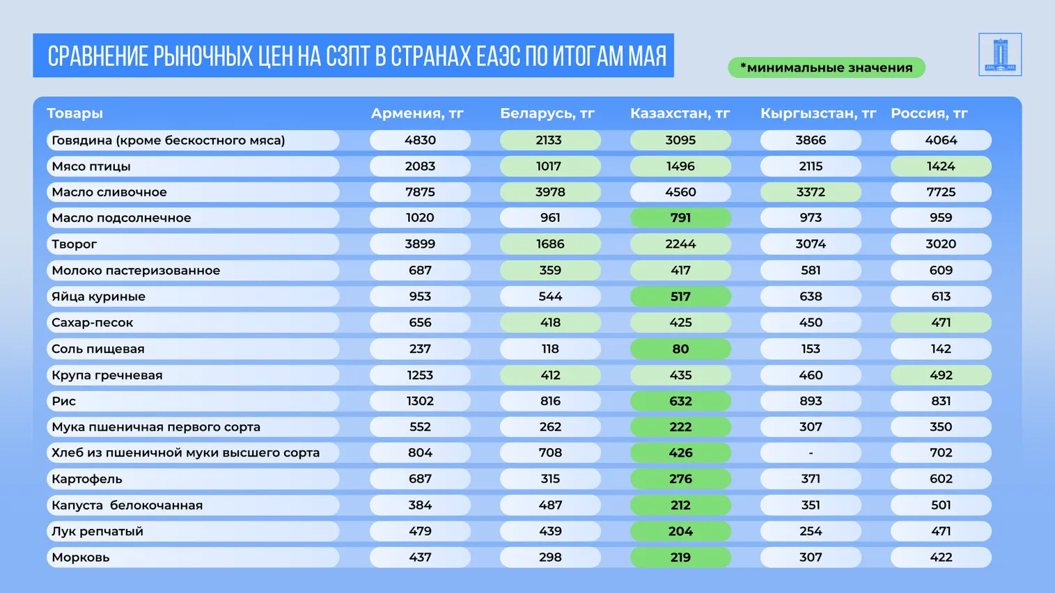 Отмечено, что Казахстан сохраняет лидирующие позиции по доступности продовольствия среди стран ЕАЭС. Сравнительный анализ рыночных цен на СЗПТ в странах ЕАЭС показал: именно в РК они остаются наиболее доступными. В частности, в Казахстане зафиксированы минимальные цены на куриные яйца, муку, хлеб, подсолнечное масло, соль, рис, картофель, капусту, лук, морковь.
