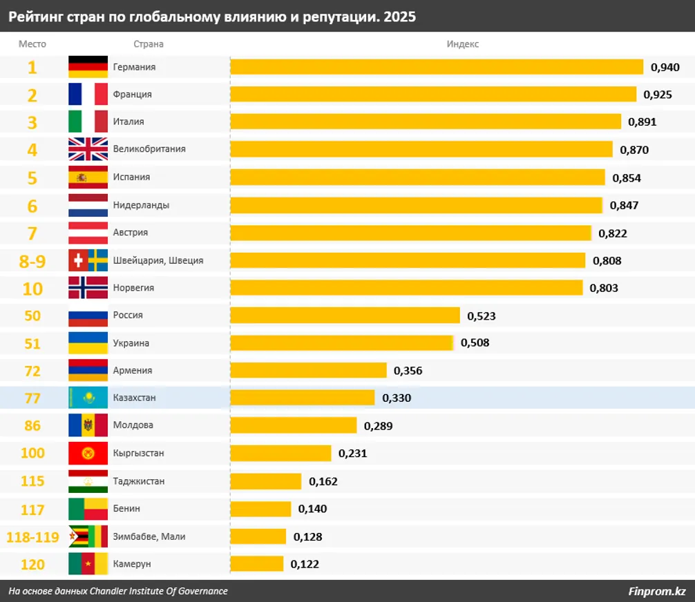 В 2025 году Казахстан опустился на 77-е место из 120 в глобальном рейтинге стран по влиянию и репутации, набрав всего 0,33 балла. Чем выше индекс, тем значимее страна в международной политике, экономике и общественном восприятии. Падение РК произошло впервые за последние три года, после роста с 2022 по 2024 год. Это тревожный сигнал уменьшения международного веса страны, сообщает Finprom.kz.