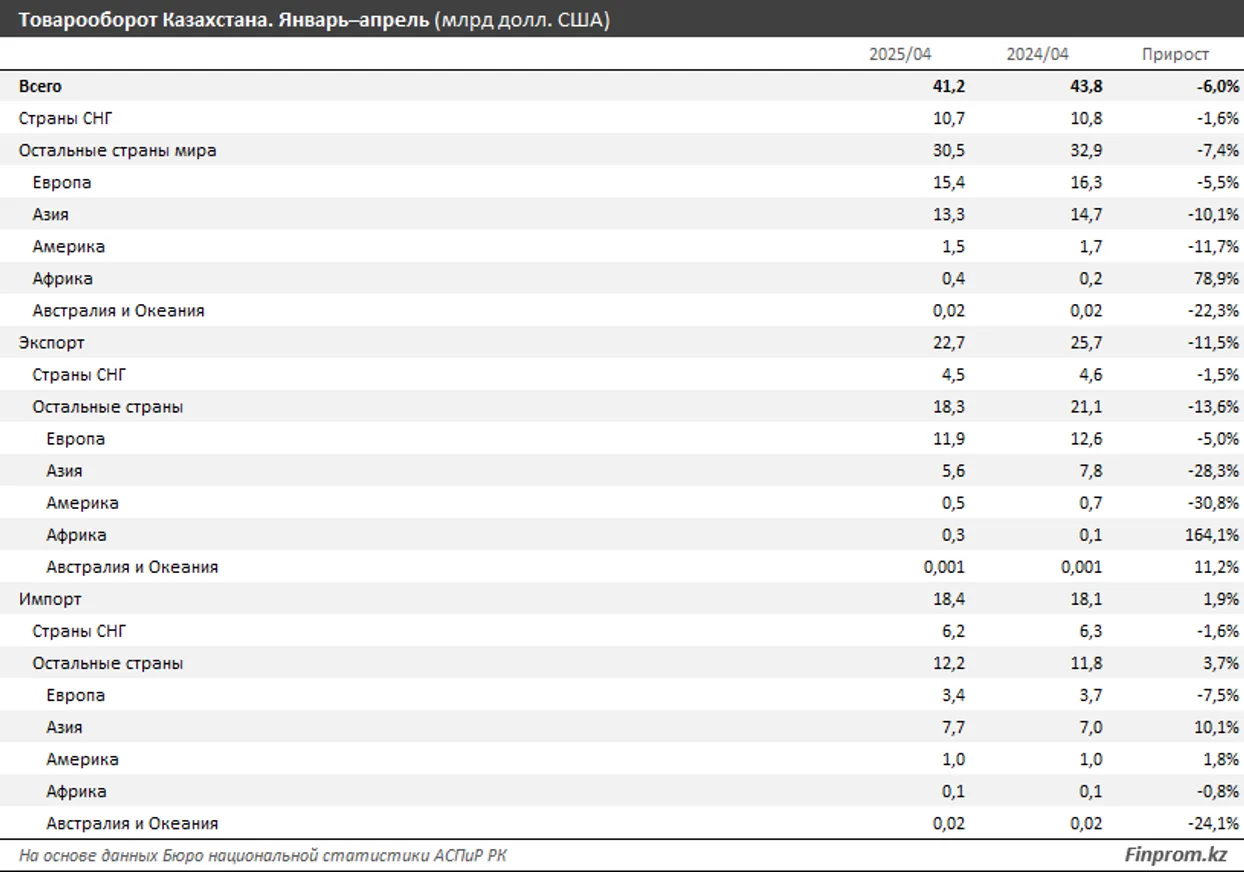 Далее рассмотрим внешнеторговый оборот РК со странами мира. Тут ситуация также не из лучших, однако это может быть связано не только с внутренними проблемами, но и с внешними шоками. Так, по итогам первых четырех месяцев 2025 года товарооборот Казахстана со всеми странами мира составил 41,2 млрд долларов — на 6% меньше, чем за аналогичный период прошлого года.
