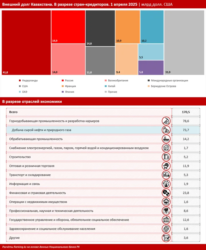 Вернемся к РК. Предлагаем посмотреть, каким странам Казахстан задолжал такие большие деньги и на что их занимал. Согласно данным Национального банка РК, общая внешняя задолженность на 1 апреля текущего года составила около 170,5 млрд долларов. Кредиторами для Казахстана являются 107 стран. В инфографике мы представили данные по 10 основным государствам, предоставлявшим РК международные займы. Наибольшую сумму казахстанские компании взяли в долг у Нидерландов: 41,8 млрд долларов. На втором месте по объему финансирования среди казахстанских кредиторов находится Россия: 14,9 млрд долларов. Третье место с равными суммами в 14 млрд долларов делят между собой Великобритания и различные международные организации.