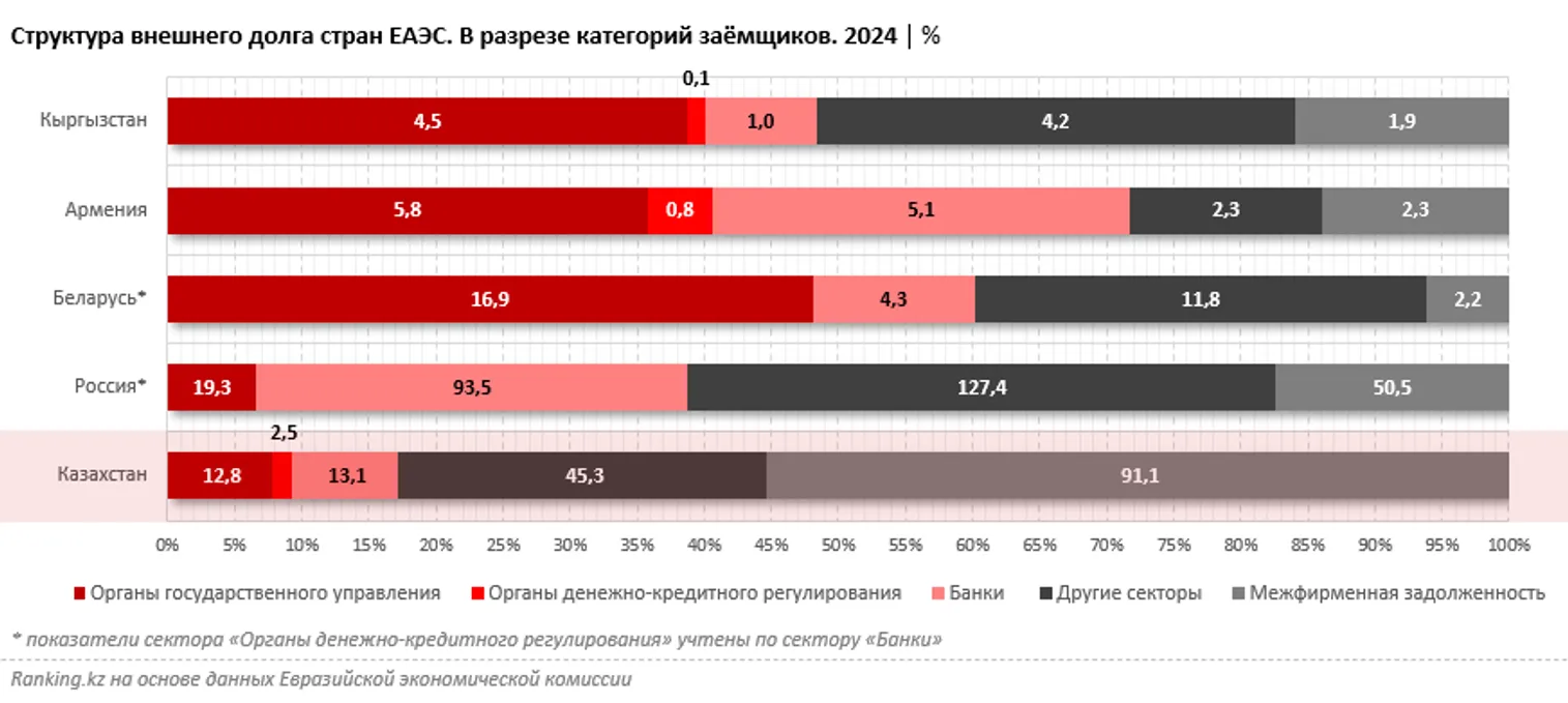 По структуре внешних финансовых обязательств страны ЕАЭС сильно отличаются. Например, в Казахстане в прошлом году больше половины (55,3%) долга составляла межфирменная задолженность: 91,1 млрд из 164,7 млрд долларов. Непосредственно на госдолг приходилось 7,8%, на банки — 8%.