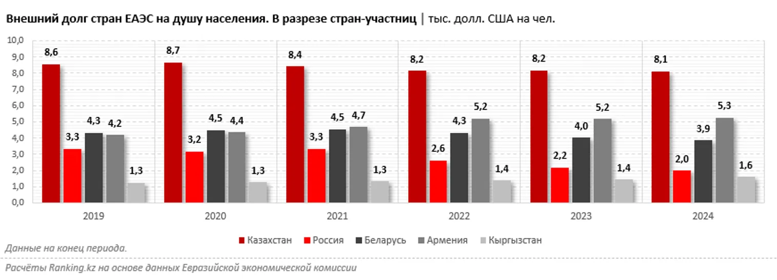 В Казахстане самый большой среди всех стран ЕАЭС внешний долг в расчете на душу населения. Такое сомнительное лидерство РК держит уже несколько лет. Согласно расчетам на основе данных Евразийской экономической комиссии (ЕЭК), в 2024 году подушевой внешний долг Казахстана составил 8,1 тыс. долларов на человека. В сравнении с показателями 2019–2023 годов это наименьшее значение: ранее сумма достигала 8,7 тыс. долларов на человека. За пять лет показатель уменьшился всего на 5,2%, сообщает Ranking.kz.