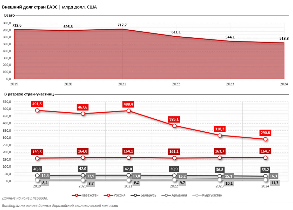 В денежном выражении общий внешний долг стран ЕАЭС с 2019 по 2024 год уменьшился на 27,2%, до 518,8 млрд долларов. Наибольшая доля по-прежнему приходится на Россию, чьи долги перед внешним миром в прошлом году составили 290,8 млрд долларов. И это единственная страна ЕАЭС, которая показала резкое сокращение обязательств за эти годы: сразу на 40,8%. Это произошло из-за антироссийских санкций и ограничения доступа бизнеса к международным финансовым рынкам.