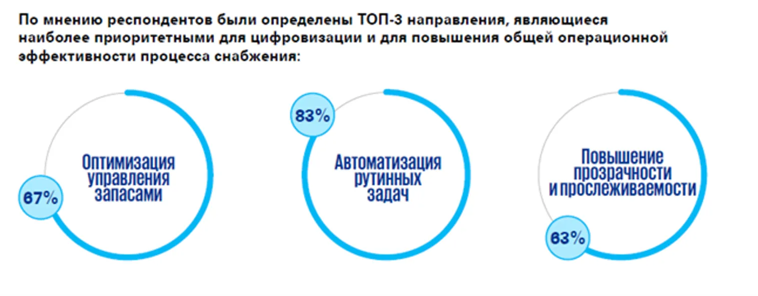 Автоматизация процессов остаётся главным направлением цифровой трансформации. Более 80% респондентов указали её как основной источник практической пользы. В число приоритетов вошли автоматическая обработка заявок и заказов, контроль исполнения контрактов, электронный документооборот, интеграция с поставщиками и применение интеллектуальных алгоритмов в принятии решений. При этом лишь 8% компаний уже внедрили ИИ на практике, хотя 58% планируют это сделать в ближайшие 12 месяцев.