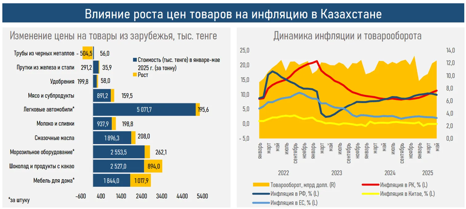 За 5М25 года наблюдается ускорение инфляции в годовом выражении в Казахстане (+11,3%), тогда как в ЕС и России данный показатель умеренно замедляется (до 2,0% и 9,4% соответственно), а в Китае сохраняется околонулевым (0,1%).