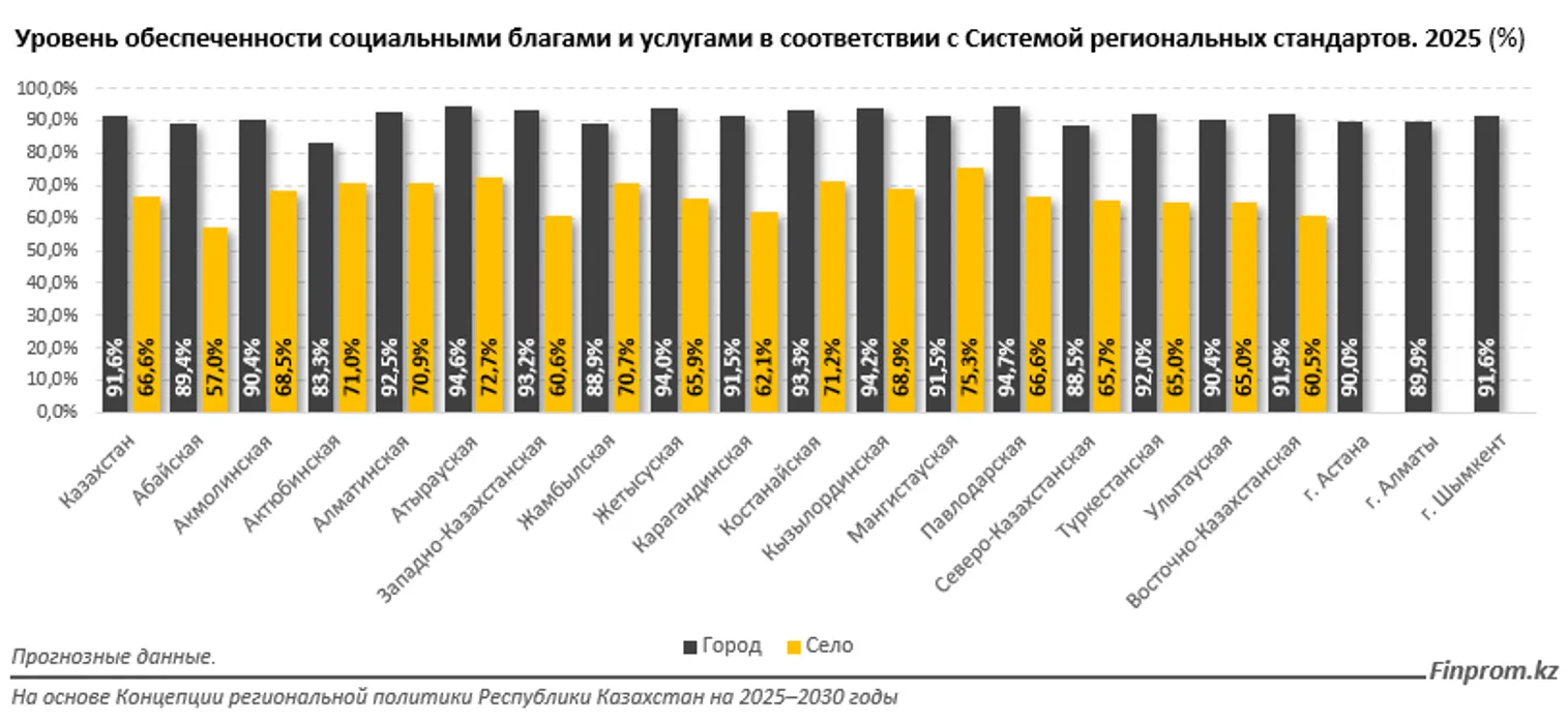 Стратегический документ содержит ключевые индикаторы, определяющие региональные диспропорции инфраструктуры. Они обозначены как уровень обеспеченности социальными благами и услугами в соответствии с Системой региональных стандартов (СРС). Власти разработали эту систему ещё в 2023 году, чтобы в цифрах видеть, где в Казахстане живётся хуже всего. Подробнее о СРС ранее писали на портале Ranking.kz.