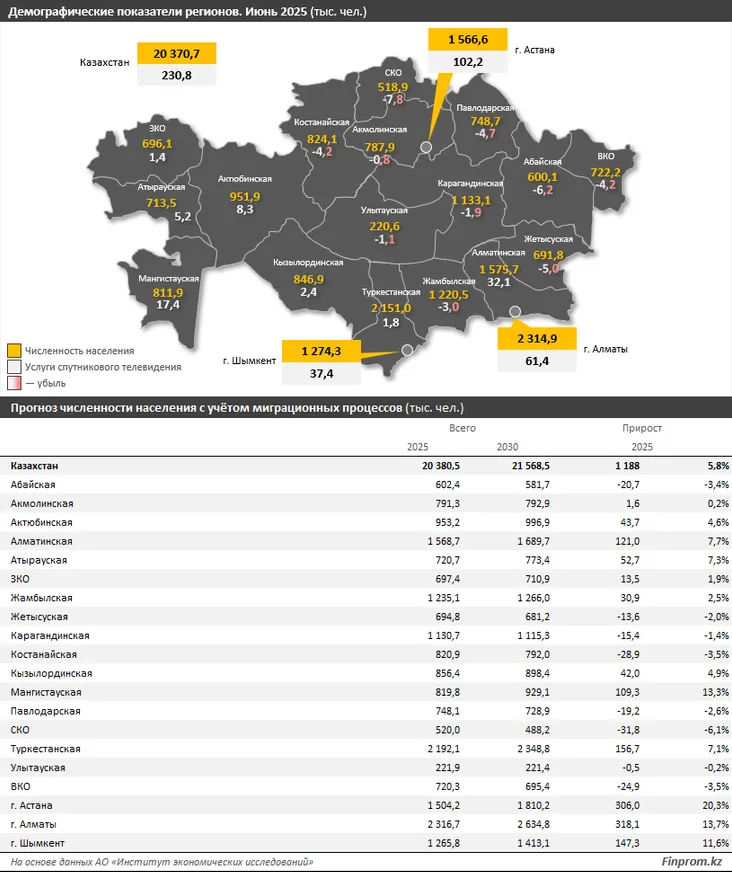 Судя по прогнозам АО «Институт экономических исследований», до 2030 года могут продолжаться существующие демографические тренды. Наибольший прирост населения будет наблюдаться в Астане (на 20,3%), Алматы (на 13,7%) и Шымкенте (на 11,6%). В северных и восточных регионах может фиксироваться демографическая убыль: в Северо-Казахстанской — на 6,1%, в Абайской — на 3,4%), в Костанайской — на 3,5%), в Восточно-Казахстанской — на 3,5%.