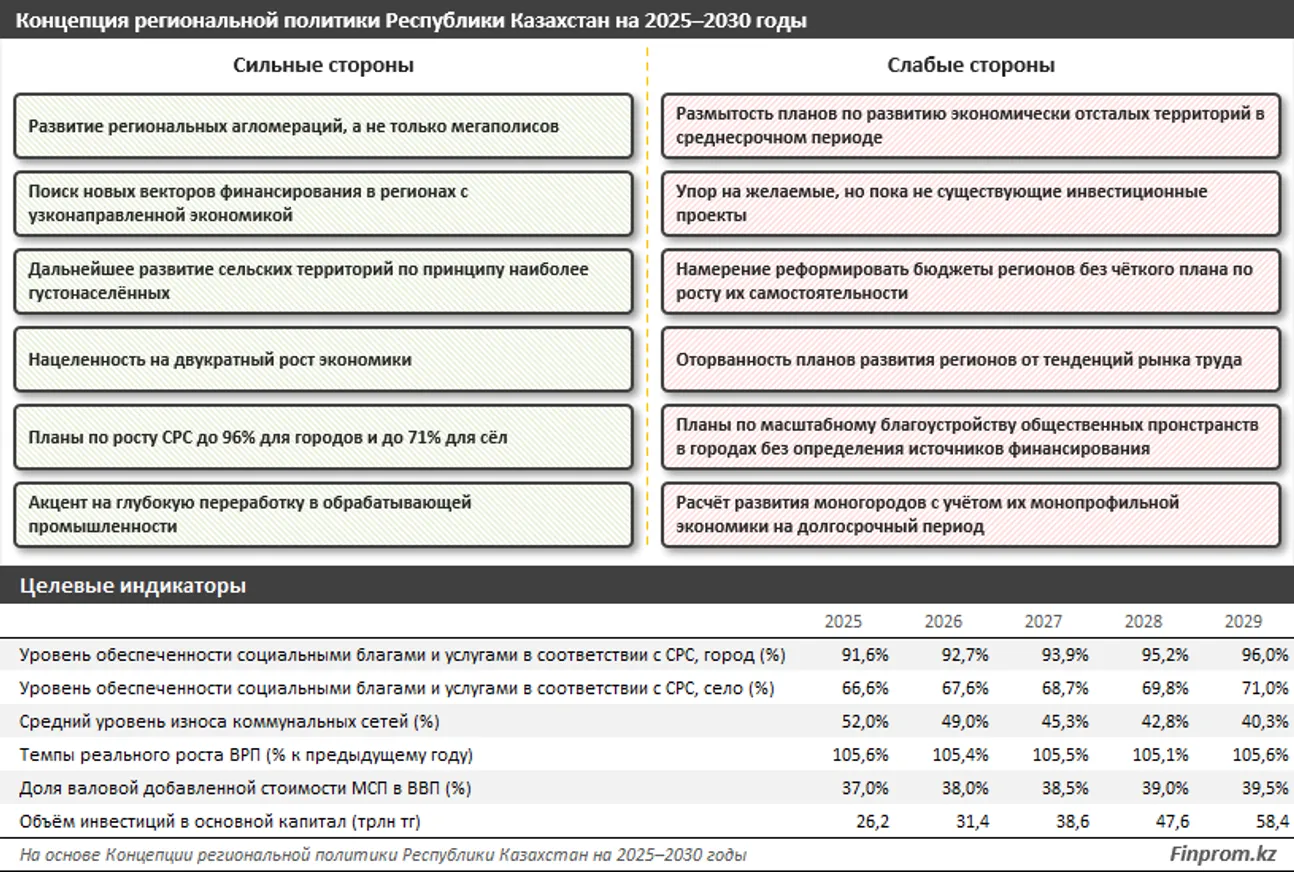 В СРС входит много социальных индикаторов — от наличия основных коммунальных благ, детских садов и больничных пунктов до нормальных дорог и широкополосного доступа в интернет. Инженерная и социальная инфраструктура — самое больное место с учётом накопившихся проблем износа сетей, нехватки школ и больниц. Согласно данным из концепции, в целом для комплексного развития инфраструктуры в ближайшие годы необходимо выделить 19 трлн тг. Из них большая часть — 11,2 трлн тг — нужна для покрытия основных потребностей регионов в базовой инфраструктуре, а ещё 7,8 млрд тг — для сокращения региональных разрывов.