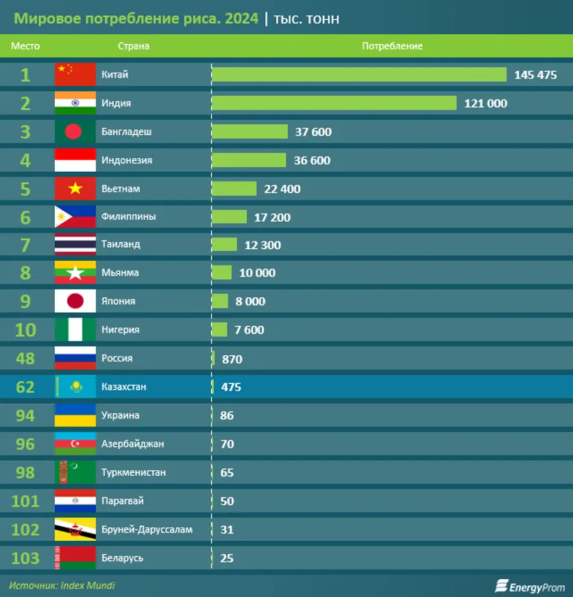 По данным Index Mundi, общее годовое потребление риса в Казахстане в 2024 году составило 475 тыс. тонн. По этому показателю РК заняла 62-е место в мире из 103. Среди стран СНГ Казахстан уступил лишь России, где потребление составило 870 тыс. тонн. Ниже РК расположились Украина* (86 тыс. тонн), Азербайджан (70 тыс. тонн), Туркменистан (65 тыс. тонн) и Беларусь (25 тыс. тонн). Рейтинг стран возглавили Китай, Индия, Бангладеш, Индонезия и Вьетнам. В конце списка оказались Беларусь, Бруней-Даруссалам и Парагвай.