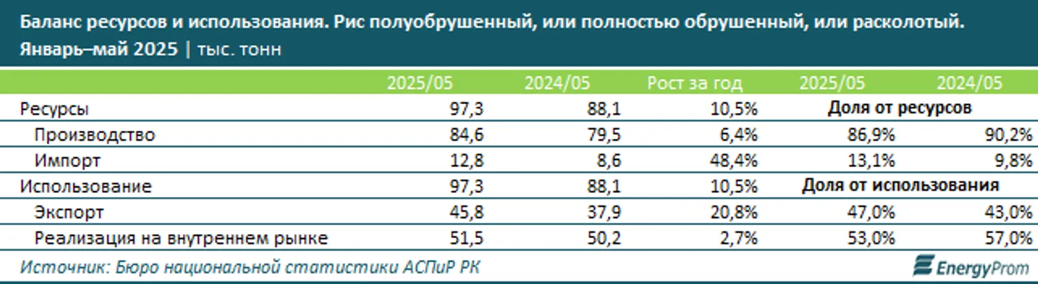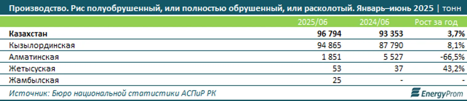 По итогам первого полугодия 2025 года в РК произвели 96,8 тыс. тонн полуобрушенного, полностью обрушенного или расколотого риса — на 3,7% больше, чем в аналогичном периоде 2024-го. Производство очищенного риса составило 2,5 тыс. тонн против всего 1 тыс. тонн годом ранее. Годовой рост — в 2,5 раза, пишет energyprom.kz.