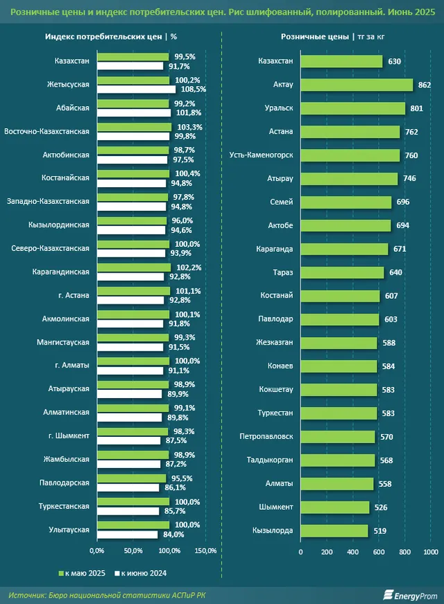 В месячной динамике снижение цен на рис наблюдалось лишь в 10 из 20 регионов РК. Наибольшее удешевление было зафиксировано в Павлодарской (на 4,5%), Кызылординской (на 4%) и Западно-Казахстанской (на 2,2%) областях, наименьшее — в Мангистауской области (на 0,7%). В четырёх регионах — Улытауской, Туркестанской и Северо-Казахстанской областях, а также в Алматы — цены на рис остались без изменений. При этом в шести регионах было зафиксировано удорожание, которое варьировалось от 3,3% в Восточно-Казахстанской до 0,1% в Алматинской области.
