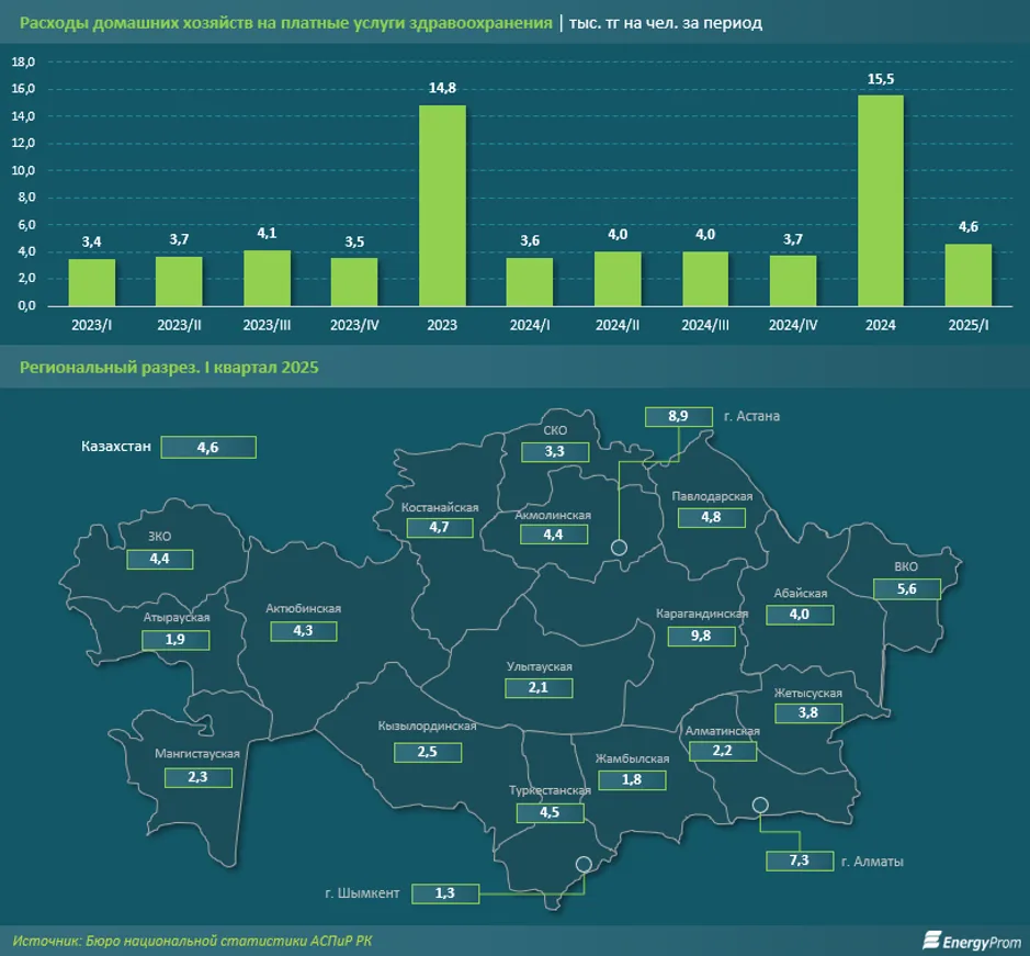 Примечательно, что в разных регионах страны показатели среднедушевых расходов на платные медицинские услуги могут сильно различаться. Например, за первый квартал 2025-го шымкентцы потратили на лечение 1,3 тыс. тенге, тогда как в Астане показатель достиг 8,9 тыс. тенге. Наибольшие среднедушевые расходы на платную медицину наблюдались в Карагандинской области: 9,8 тыс. тенге — в 2 раза больше, чем в среднем по стране.