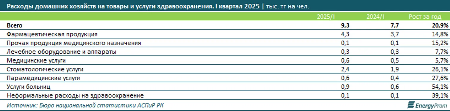 Результаты выборочных обследований домохозяйств также детализируют конкретные статьи медицинских расходов казахстанцев. Начнём с того, что в общую сумму трат на здравоохранение входят медицинские услуги и товары — лекарства и прочая продукция медицинского назначения. И именно фармацевтические препараты составляют основную долю семейного бюджета на здравоохранение. В целом на медицину в первом квартале текущего года казахстанцы тратили в среднем 9,3 тыс. тенге — на 20,9% больше, чем в январе–марте 2024-го. Из этой суммы 4,7 тыс. тенге (или 50,4%) было потрачено на лекарства, лечебное оборудование и аппараты. За год расходы по этим статьям выросли на 14,3%.