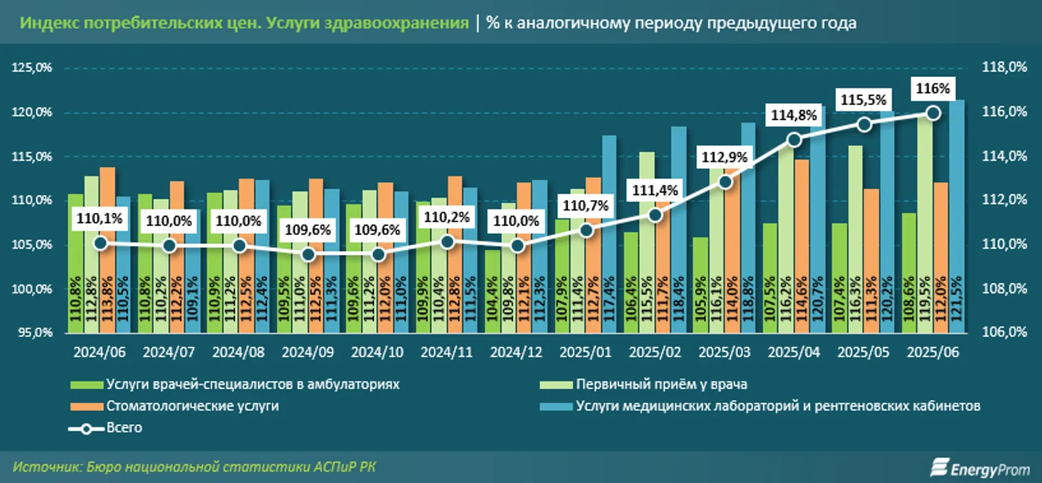 В Казахстане ускорился рост цен на медицинские услуги. По информации из отчётов Бюро национальной статистики (БНС) АСПиР РК, с начала года до июня индекс потребительских цен на услуги здравоохранения вырос с 10% до 16%. Это обусловлено инфляционными процессами, влияющими на удорожание всех платных услуг, цены на которые за год повысились на 16,1% и оказали давление на общий показатель инфляции (11,8%), сообщает energyprom.kz.