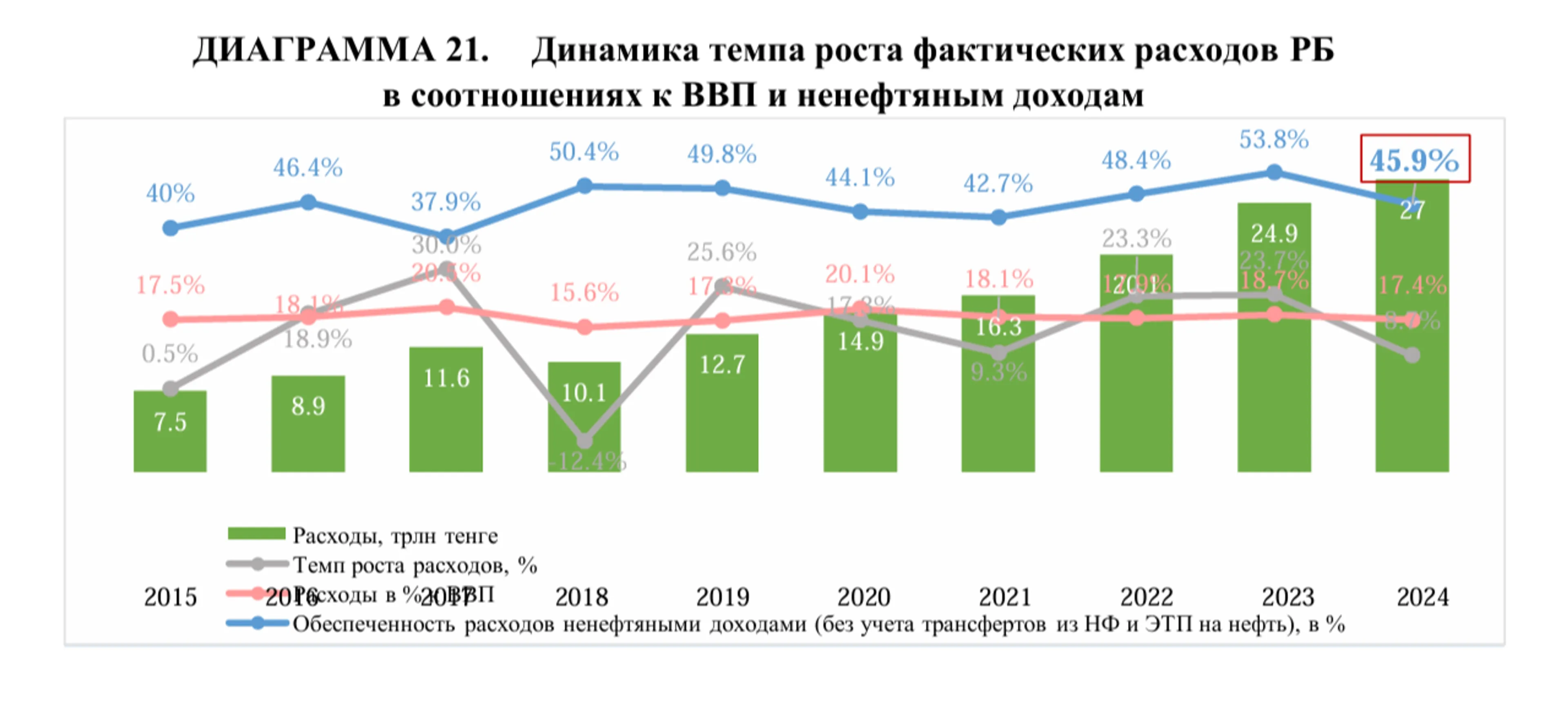 За последние 10 лет среднегодовой темп роста расходов составил 14,5%, оставаясь на стабильном уровне в пределах 18% от ВВП. В абсолютном выражении расходы выросли в 3,6 раза - с 7,5 до 27 трлн тенге.