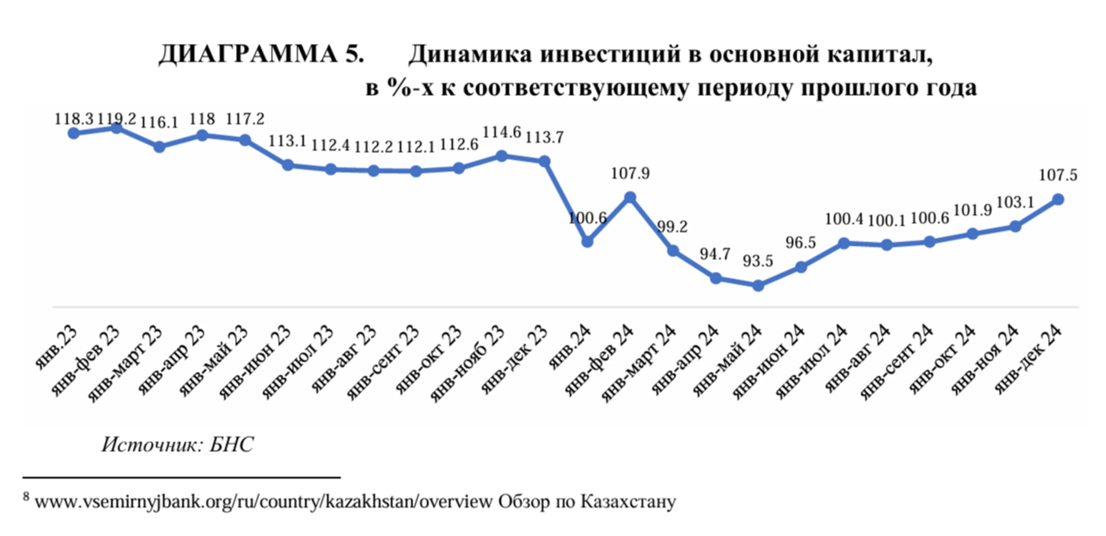 По информации Всемирного банка, снижение инвестиций, а также государственных расходов стали основными факторами замедления экономического роста Казахстана до 3,2% в первой половине 2024 года. В 2024 году объем инвестиций в основной капитал составил 19 375 млрд тенге, что на 7,5% больше, чем в 2023 году (в сопоставимых ценах).