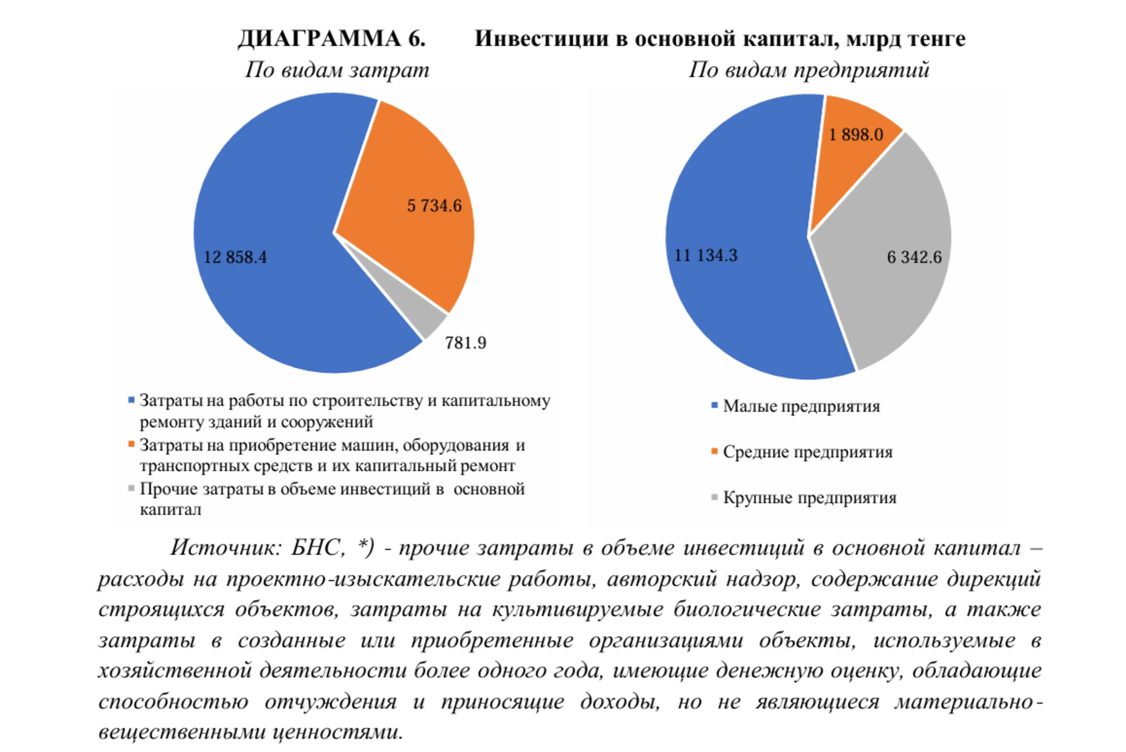 Доля собственных средств хозяйствующих субъектов снизилась с 73,6% в 2023 году до 64,5% (или 12 487,9 млрд тенге), в то время как доля бюджетных средств выросла с 16,6% до 21,2% (или 4098,3 млрд тенге), а доля банковского сектора увеличилась с 11,2% до 14,4% (или 2788,7 млрд тенге).