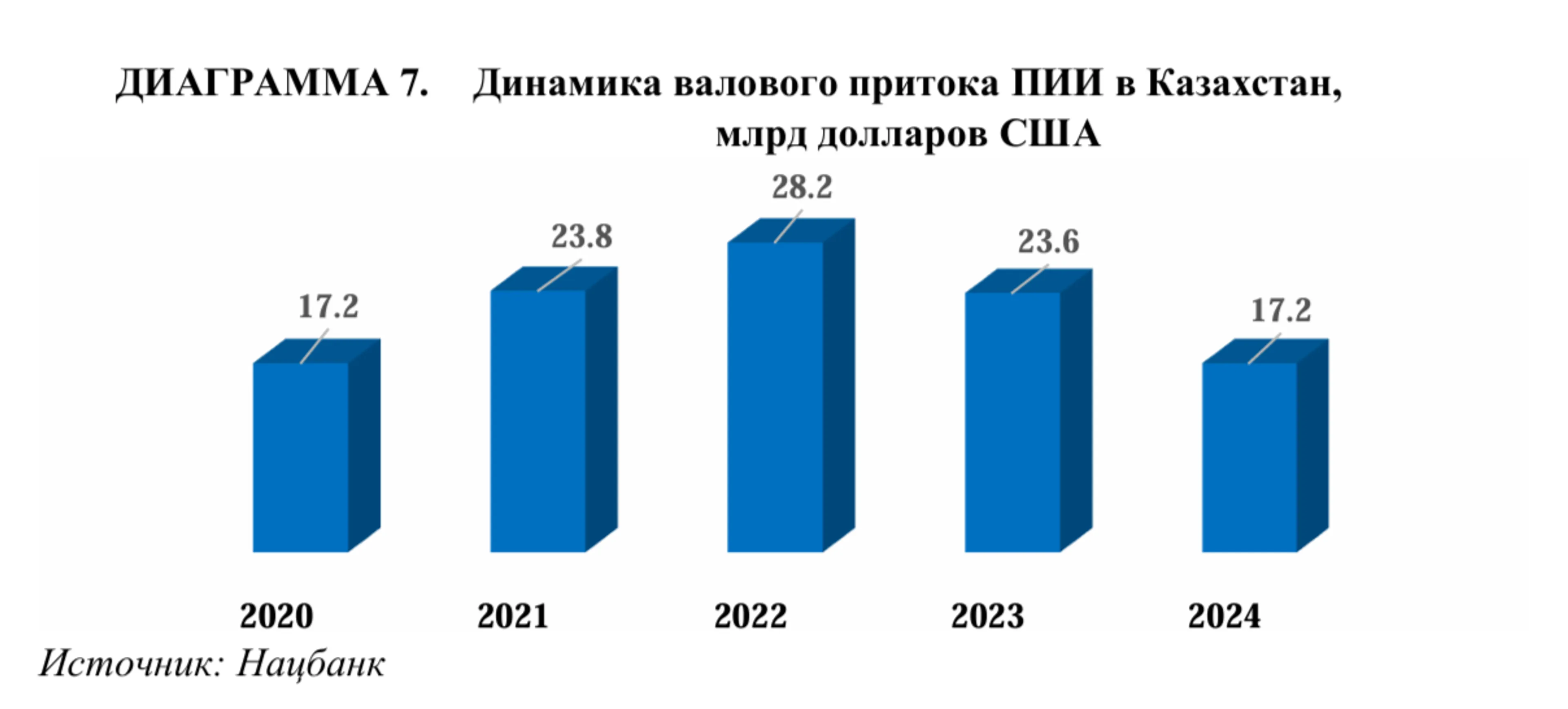 Несмотря на принимаемые меры по поиску и привлечению иностранных инвесторов, а также предоставляемым им значительным преференциям, второй год подряд отмечается резкое сокращение прямых иностранных инвестиций (ПИИ). Так, валовый приток ПИИ в Казахстан по итогам 2024 года снизился почти на 30% и составил 17 162 млн долларов, что на 6450 млн долларов меньше по сравнению с 2023 годом.