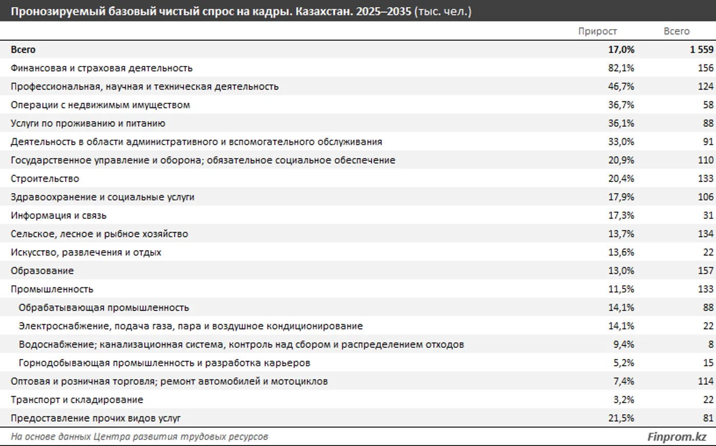 Согласно прогнозу от Центра развития трудовых ресурсов, в Казахстане спрос на кадры вырастет с 2025 по 2035 год почти на 3 млн, при этом чистый спрос за исключением тех, кого заместят и кто покинет рынок по другим причинам, составит 1,6 млн работников.