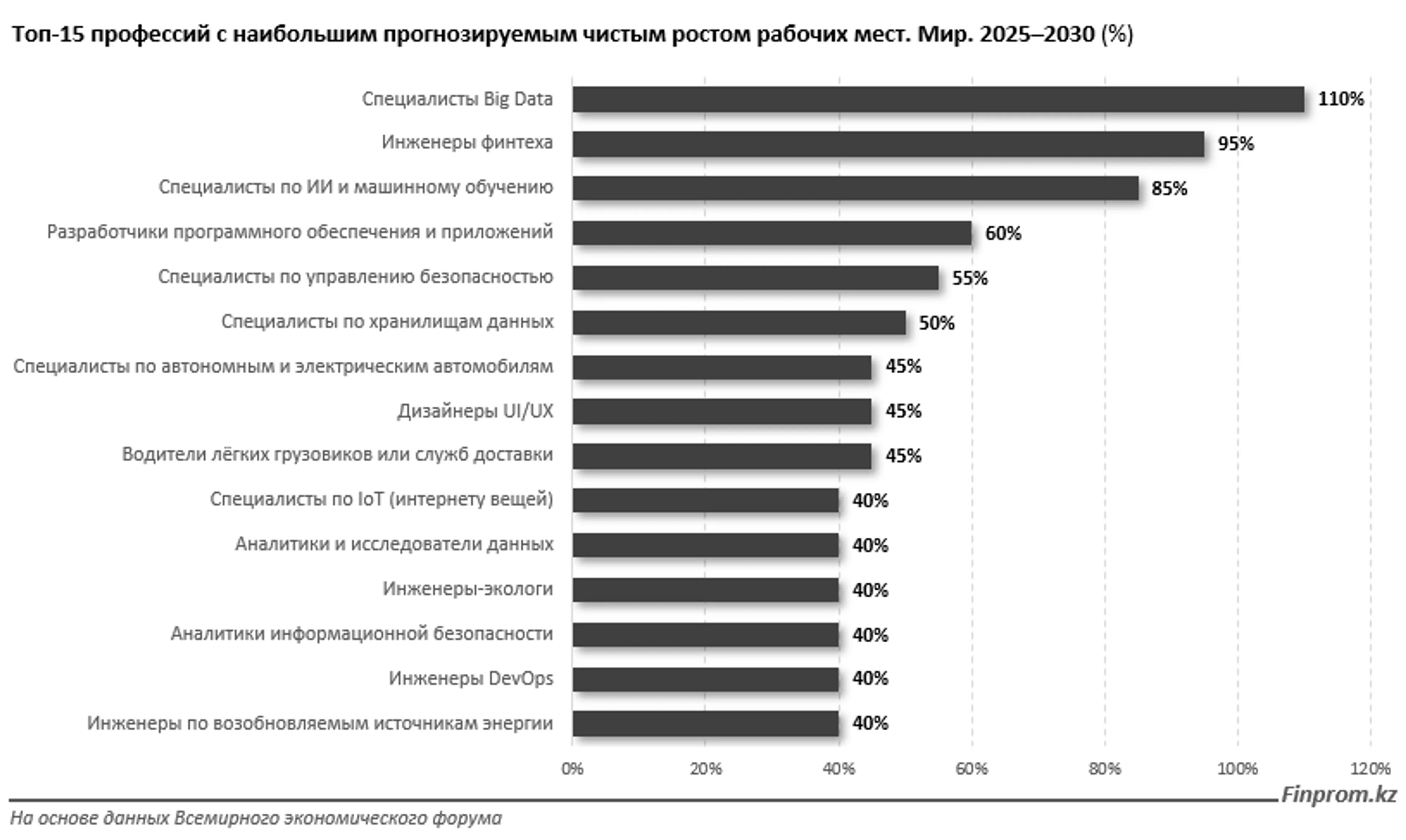 Несмотря на глобальный тренд, в Казахстане в топ-100 востребованных профессий не входят специалисты ИИ, Big Data и финтеха. Вместо этого в число лидеров попали охранники и водители: 131,7 тыс. и 80,2 тыс. рабочих мест соответственно.