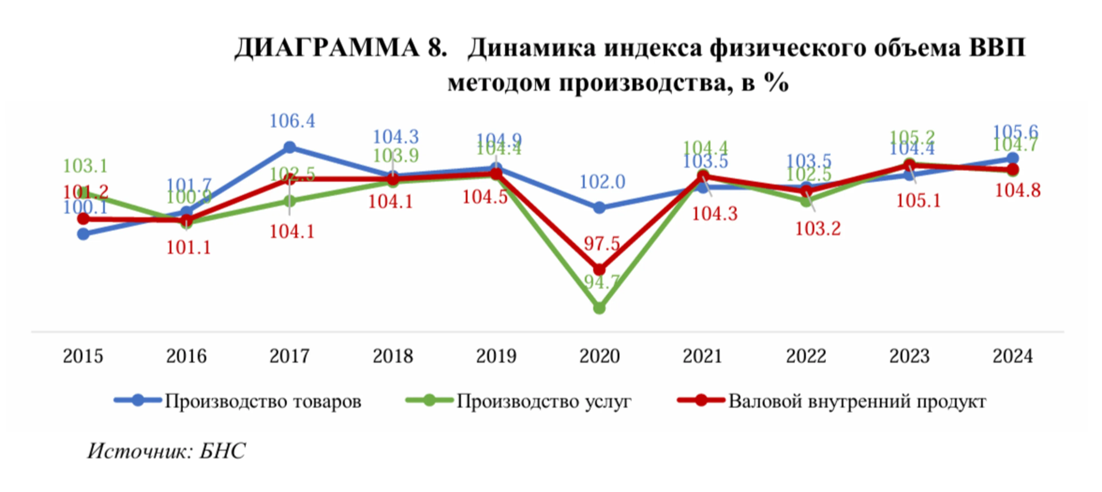 В структуре ВВП за 2024 год наблюдается значительное преобладание сферы услуг (58,4%) над производством товаров (35,4%). Это соответствует общей тенденции структурных изменений в экономике, которая наблюдалась в течение последнего десятилетия. При этом, в отличие от данного тренда, в 2024 году отмечается опережающий рост производства товаров (5,5%) по сравнению с производством услуг (4,7%).