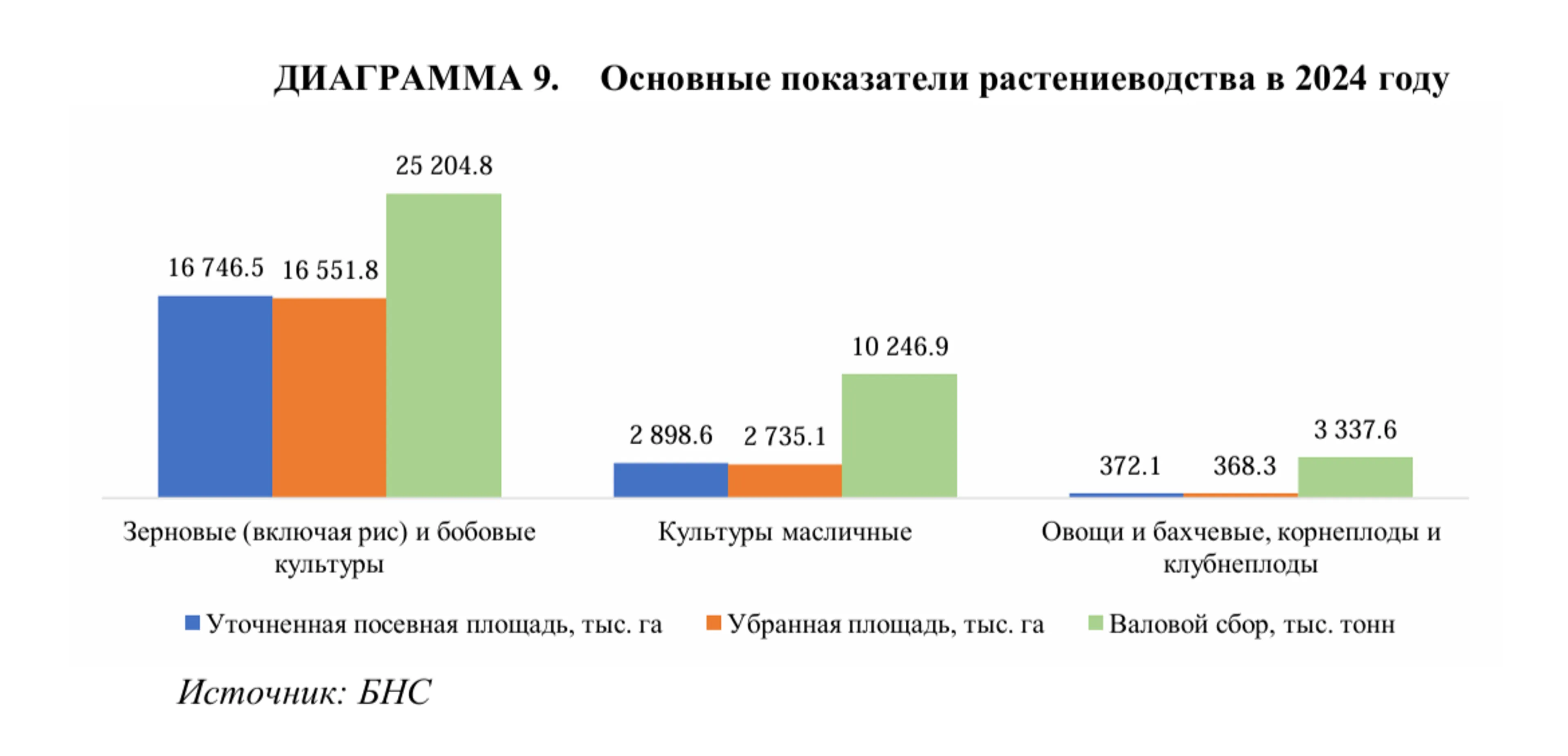 Несмотря на амбициозные планы по увеличению экспорта по зерновым культурам до 12 млн тонн (из которых 7-7,5 млн тонн приходится на пшеницу, 1,4 млн тонн – на ячмень, 300 тыс. тонн – на кукурузу. По масличным культурам потенциал оценивается в более 1 млн тонн), фактические результаты оказались ниже этой цели. Так, по данным Бюро нацстатистики (БНС), за 2024 год произведено 18,6 млн тонн пшеницы, из которых 5,9 млн тонн экспортировано, 14,3 млн тонн реализовано на внутреннем рынке.