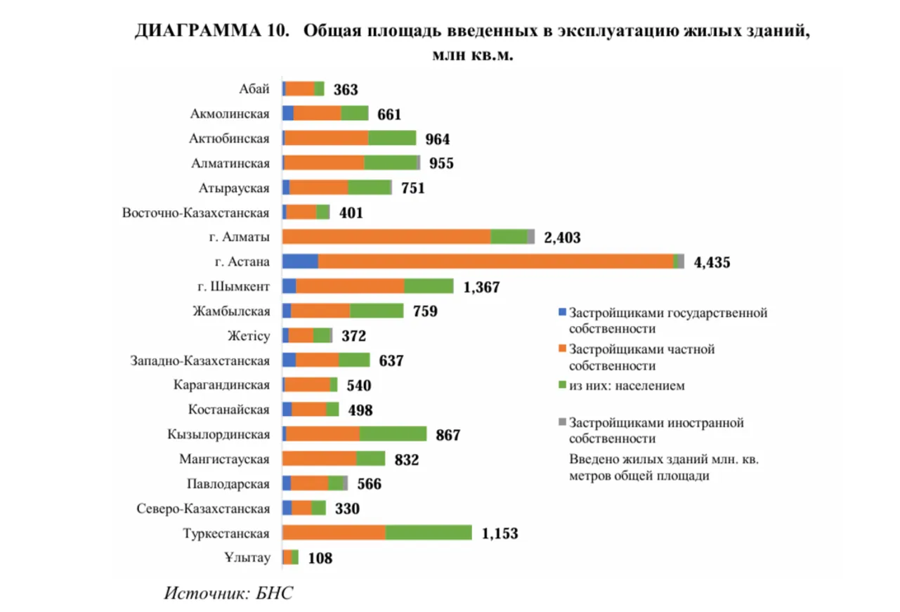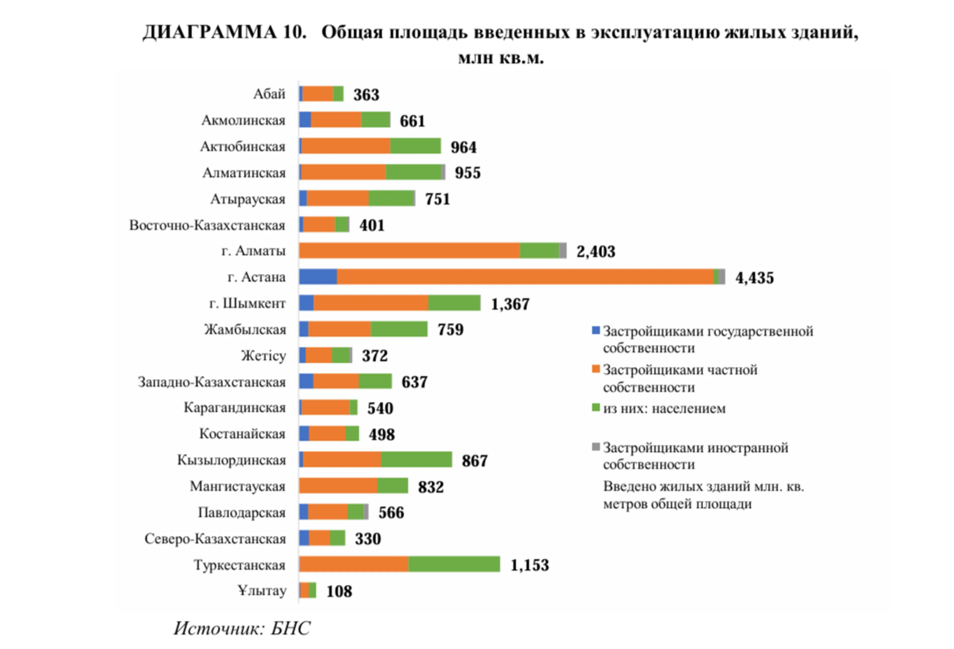 Подавляющая часть нового жилья (90,6% или почти 17,2 млн квадратных метров) была построена частными застройщиками, причем значительный объем (почти 7 млн квадратных метров) возведен непосредственно населением.