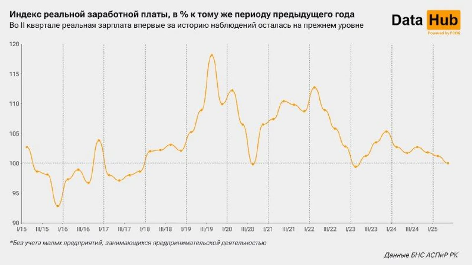 По итогам II квартала 2025 года в Казахстане среднемесячная заработная плата в пересчете на одного работника составила 448,6 тыс. тенге*. К тому же периоду 2024 года показатель вырос номинально на 11,3%. Однако в реальном выражении, то есть с поправкой на потребительскую инфляцию, он не изменился. Перед этим восемь кварталов подряд шел рост, сообщают в DATA HUB.