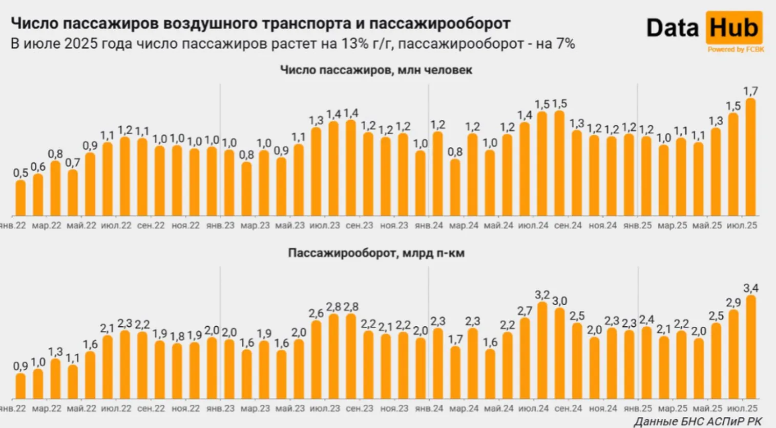 В июле 2025 года работающие в Казахстане компании воздушных перевозок обслужили 1,7 млн человек – на 12,9% больше, чем в июле 2024 года. Актуальное значение – самое высокое для любого месяца по крайней мере с начала 2007 года, передает центр деловой информации Kapital.kz со ссылкой на Телеграм-канал Первого кредитного бюро DataHub.
