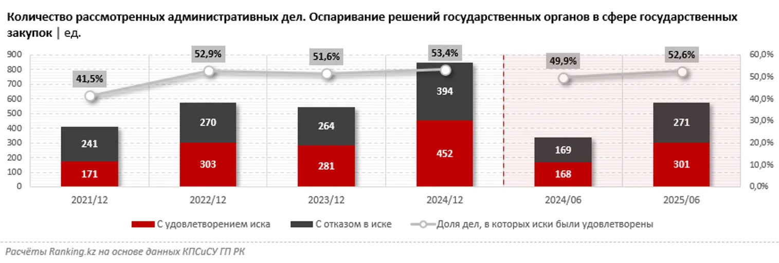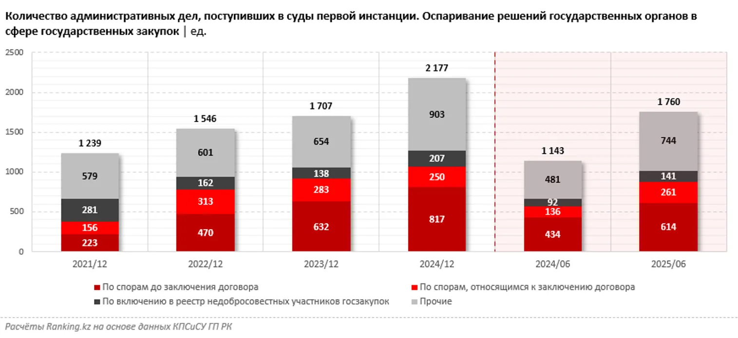 Согласно данным из отчётов Комитета правовой статистики и специальных учётов Генеральной прокуратуры (КПСиСУ ГП) РК, за январь–июнь текущего года общее количество административных дел по оспариванию решений государственных органов в сфере госзакупок, поступивших в суды первой инстанции, составило 1,8 тыс. — на 54% больше по сравнению с первым полугодием 2024-го. Чуть более трети — 614 — таких судебных дел касались споров, возникших ещё до заключения договора закупок. Их число выросло на 41,5%. Меньшую долю занимали иски об оспаривании действий госорганов непосредственно при заключении договоров с участниками системы госзакупок. За полгода насчитывалось 261 такое дело — практически вдвое больше, чем за январь–июнь 2024-го.