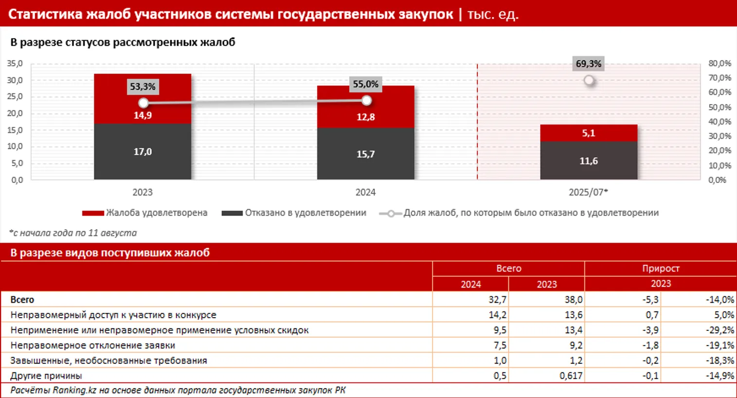 Вернёмся на шаг назад и посмотрим, как уполномоченными органами рассматриваются жалобы, которые ещё не дошли до суда. Именно из этой исходной точки становится понятно, почему так изменилась статистика судебных дел. Дело в том, что участникам госзакупок стали чаще отказывать в рассмотрении жалоб на самом первом этапе. По данным с портала goszakup.gov.kz, доля жалоб участников госзакупок, по которым был получен отказ в удовлетворении, за первые семь месяцев текущего года составила 69,3% (за 2024 год — 55%).