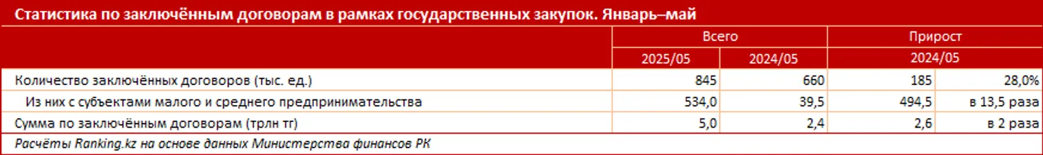 Ещё одной возможной причиной роста числа судебных дел по госзакупкам может быть общее увеличение количества договоров по госзакупкам. Изменения в законодательстве позволили быстрее проводить тендерный процесс и предоставлять больше возможностей поставщикам на местном уровне. Это сразу отразилось на статистике. По данным Министерства финансов РК, количество заключённых договоров за январь–май текущего года достигло 845 тыс., увеличившись на 28% в сравнении с аналогичным периодом 2024-го. Новшества в первую очередь затронули малый и средний бизнес. Число контрактов с субъектами МСП выросло в 13,5 раза, достигнув 534 тыс., а общая сумма закупок за этот период увеличилась вдвое.