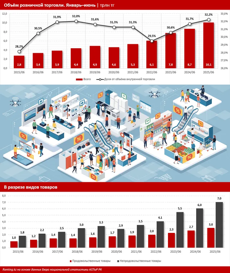 Объем розничной торговли в первом полугодии достиг 10,1 трлн тенге — на 15,7% больше в денежном выражении, чем в аналогичном периоде прошлого года