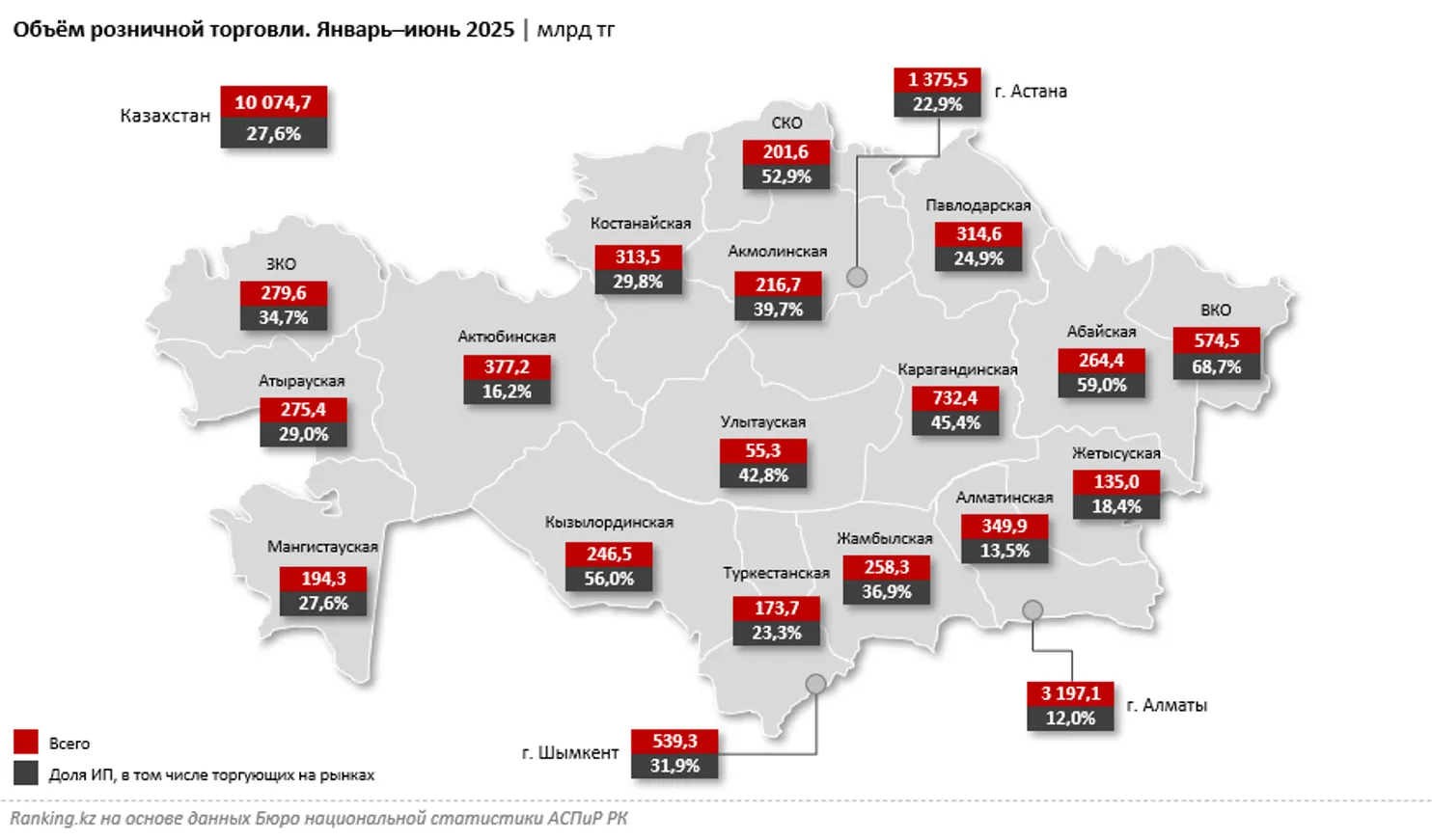 При этом стоит отметить, что в четырёх регионах РК более половины объёма розничной торговли пришлось на ИП: в Восточно-Казахстанской области — 68,7%, в Абайской — 59%, в Кызылординской — 56%, в Северо-Казахстанской — 52,9%. Значительная доля ИП в розничной торговле была зафиксирована также в Карагандинской (45,4%) и Улытауской (42,8%) областях. Наименьший удельный вес ИП в розничной торговле наблюдался в Алматы и Алматинской области: лишь 12% и 13,5% соответственно. Следом идут Актюбинская (16,2%) и Жетысуская (18,4%) области.
