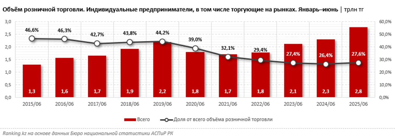На индивидуальных предпринимателей, в том числе торгующих на рынках, пришлось 27,6% от общего объёма розничной торговли, или 2,8 трлн тенге за январь–июнь текущего года — на 20,8% больше, чем за аналогичный период 2024-го. Годом ранее доля ИП в розничной торговле составляла 26,4% — меньше, чем в текущем году. При этом пять лет назад на ИП приходилось 39%, а десятилетием ранее — и вовсе внушительные 46,6%.