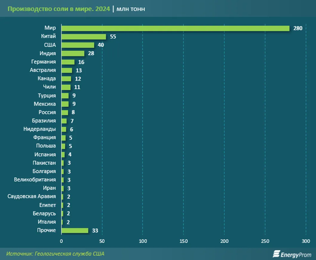 Как обстоят дела в других странах? Производство соли в мире за прошлый год, по данным Геологической службы США, составило 280 млн тонн — на 3,7% больше, чем за 2023-й. Крупнейшим производителем соли является Китай, на который пришлось 55 млн тонн. Следом идут США и Индия: 40 млн и 28 млн тонн соответственно. Значительные объёмы также пришлись на Германию (16 млн тонн), Австралию (13 млн тонн), Канаду (12 млн тонн) и Чили (11 млн тонн). Следует отметить Россию, которая также входит в число крупнейших производителей соли: 8 млн тонн. Тем временем в Казахстане, по данным Бюро национальной статистики АСПиР РК, за 2024 год добыто 1,8 млн тонн соли, чистого хлорида натрия и морской воды.