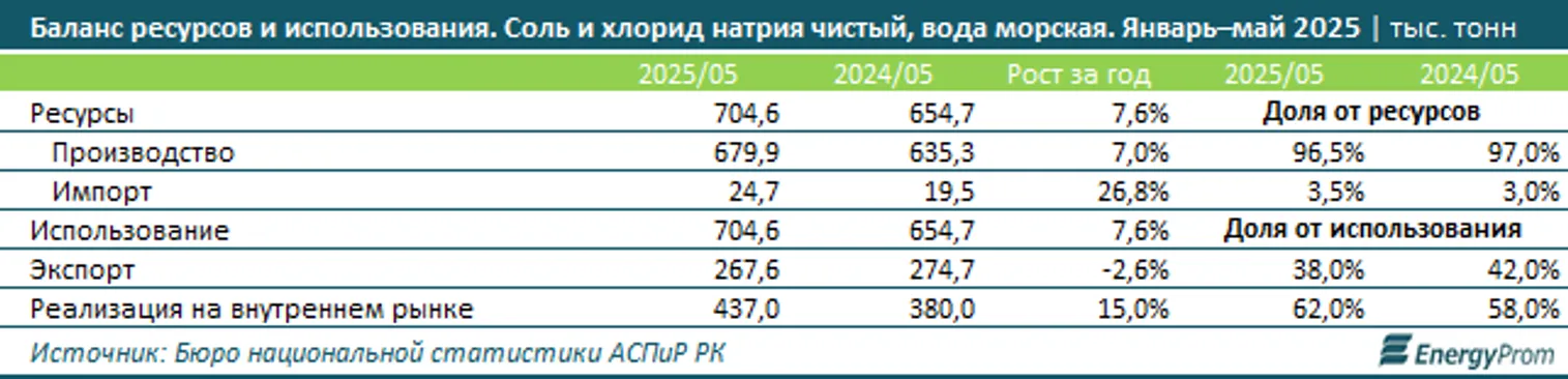 Практически вся казахстанская соль, предназначенная для внешних рынков, экспортируется в Россию. Так, за январь–июнь 2025-го из всего объёма экспорта (316,7 тыс. тонн на сумму 15,4 млн долларов) только на РФ пришлось 305,4 тыс. тонн соли на сумму 15 млн долларов. Ещё 10,5 тыс. тонн было отправлено в Кыргызстан. Оставшиеся менее 1 тыс. тонн экспортированной соли суммарно пришлись на прочие страны, среди которых можно отметить Грузию (264 тонны) и Китай (219,4 тонны).