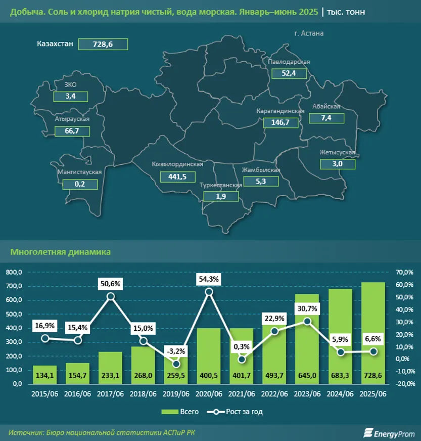 Добыча соли* в Казахстане за январь–июнь текущего года составила 728,6 тыс. тонн — на 6,6% больше, чем за первое полугодие 2024-го. Показатель растёт уже шестой год подряд. Более половины добычи пришлось лишь на Кызылординскую область: 441,5 тыс. тонн. Следом идут Карагандинская и Атырауская области: 146,7 тыс. и 66,7 тыс. тонн соответственно. Значительный объём также пришёлся на Павлодарскую область: 52,4 тыс. тонн. В остальных регионах добыча соли варьировалась от 189 до 7,4 тыс. тонн, сообщает energyprom.kz.