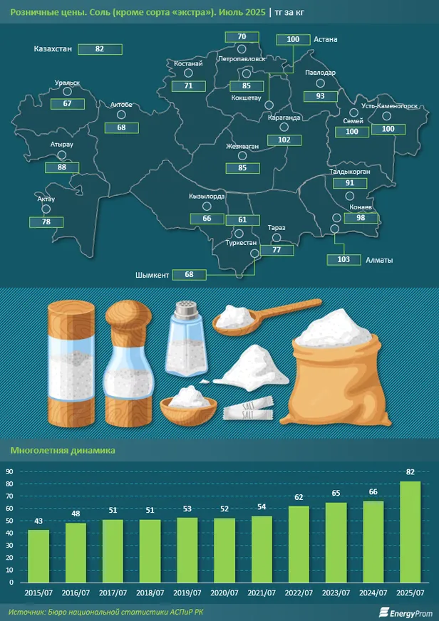 Цены на соль (кроме сорта «экстра») в городах РК по итогам июля 2025 года значительно варьировались: от 61 тенге за кг в Туркестане до 103 тенге в Алматы. Самая дорогая соль, помимо Алматы, также продавалась в Караганде (102 тенге за кг), Астане (100 тенге) и Семее (100 тенге). Самые низкие цены, кроме Туркестана, наблюдались в Кызылорде (66 тенге за кг), Уральске (67 тенге), Актобе (68 тенге) и Шымкенте (68 тенге). В среднем по Казахстану килограмм соли стоил 82 тенге — значительно дороже, чем в июле прошлого года (66 тенге). Для сравнения: в июле 2023-го соль продавалась в среднем по 65 тенге за кг.