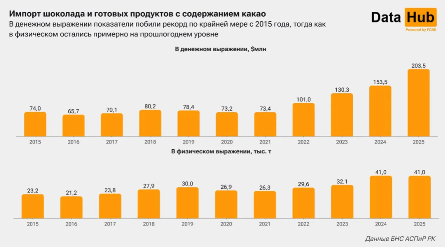 В Казахстан ввезли шоколадные изделия на рекордную сумму, сообщает Телеграм-канал Первого кредитного бюро DataHub.
