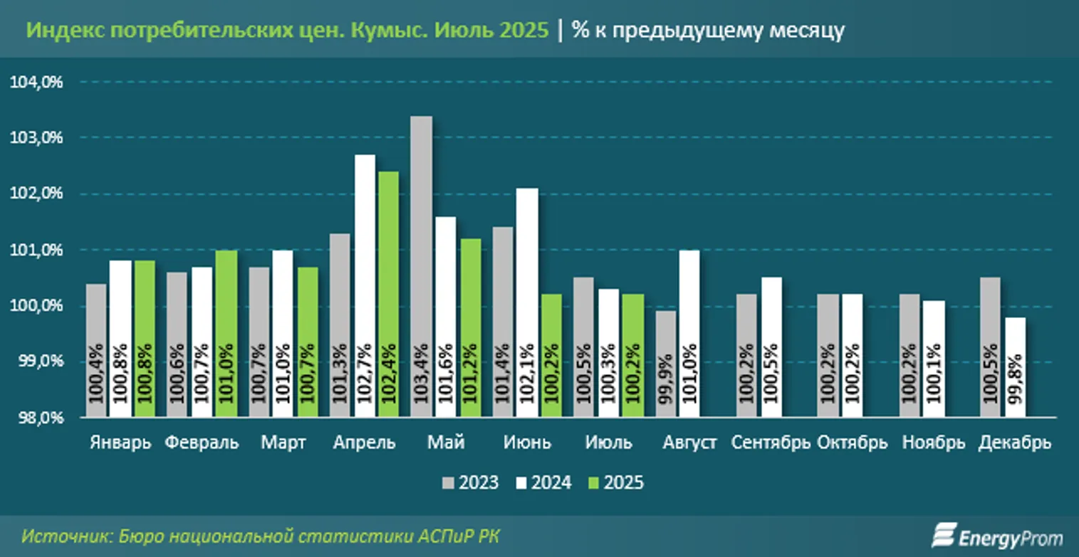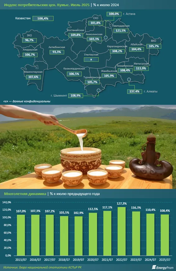 Бюро национальной статистики АСПиР РК предоставляет данные по ценам только на кумыс. По итогам июля 2025 года этот кисломолочный напиток подорожал на 0,2% за месяц. Для сравнения: в июне также был отмечен рост цен на 0,2%, а в июле прошлого года — на 0,3%.