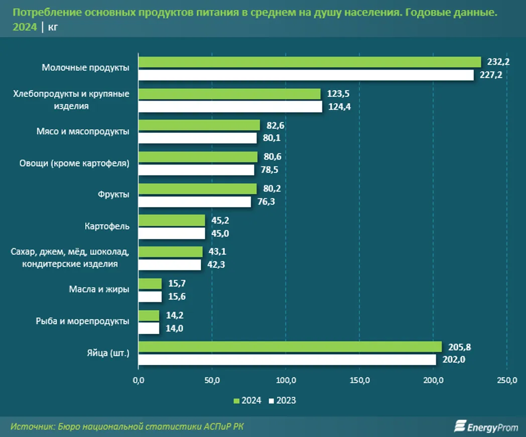 Молочные продукты — одни из самых потребляемых среди основных продуктов питания населения. Так, за 2024 год в среднем на каждого казахстанца пришлось 232,2 кг молочных продуктов— сразу на 5 кг больше, чем за 2023 год, сообщает Energyprom.kz.