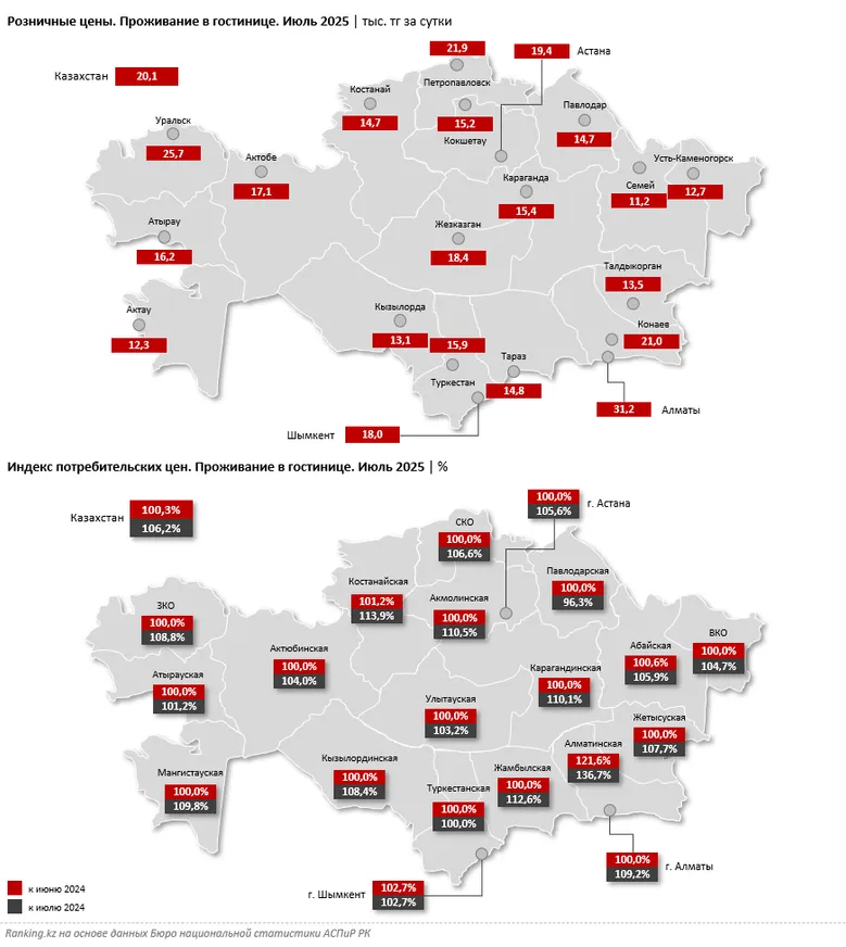 В годовом выражении удорожание проживания в гостинице было зафиксировано почти во всех регионах. Исключение составили Туркестанская область, где цены остались на уровне июля прошлого года, и Павлодарская область, где услуги гостиниц подешевели на 3,7%. В остальных регионах наблюдался рост цен — от 36,7% в Алматинской до 1,2% в Атырауской области.