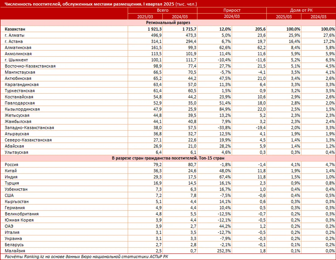 В региональном разрезе больше всего туристов традиционно принял Алматы: 496,9 тыс. человек — на 5% больше, чем годом ранее. В пятёрку регионов-лидеров также вошли Астана (314,1 тыс. человек), Алматинская область (161,5 тыс. человек), Акмолинская область (113,5 тыс. человек) и Шымкент (100,1 тыс. человек).