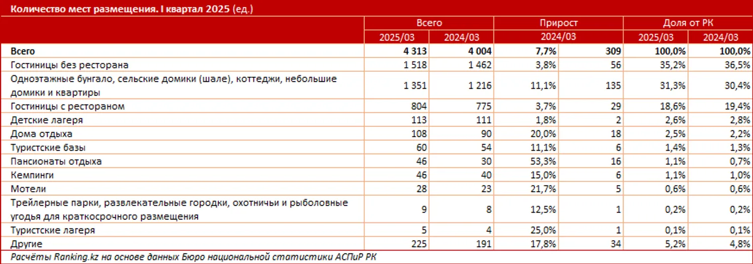 В первом квартале текущего года в Казахстане насчитывалось 4,3 тыс. мест размещения, против 4 тыс. годом ранее, рост — на 7,7%. Среди них было 1,5 тыс. гостиниц без ресторана, 1,4 тыс. одноэтажных бунгало, сельских домиков (шале), коттеджей, небольших домиков и квартир, 804 гостиницы с рестораном, 113 детских лагерей, 108 домов отдыха, 60 туристских баз, 46 пансионатов отдыха, столько же кемпингов, 28 мотелей, девять трейлерных парков, развлекательных городков, охотничьих и рыболовных угодий для краткосрочного размещения, пять туристских лагерей, пишет ranking.kz.