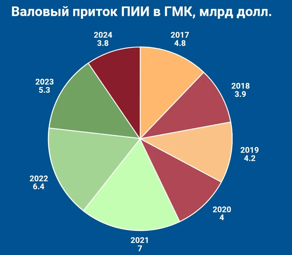 ГМК Казахстана долго удерживал позиции лидера по зарубежному капиталу. Но в 2024 году приток прямых иностранных инвестиций в ГМК упал на 29% — с 5,38 млрд до 3,84 млрд долларов. Для сравнения: в 2022 году поступило 6,4 млрд, в 2021-м — рекордные 7 млрд. Пик интереса пришелся на запуск крупных проектов по добыче и металлургии.