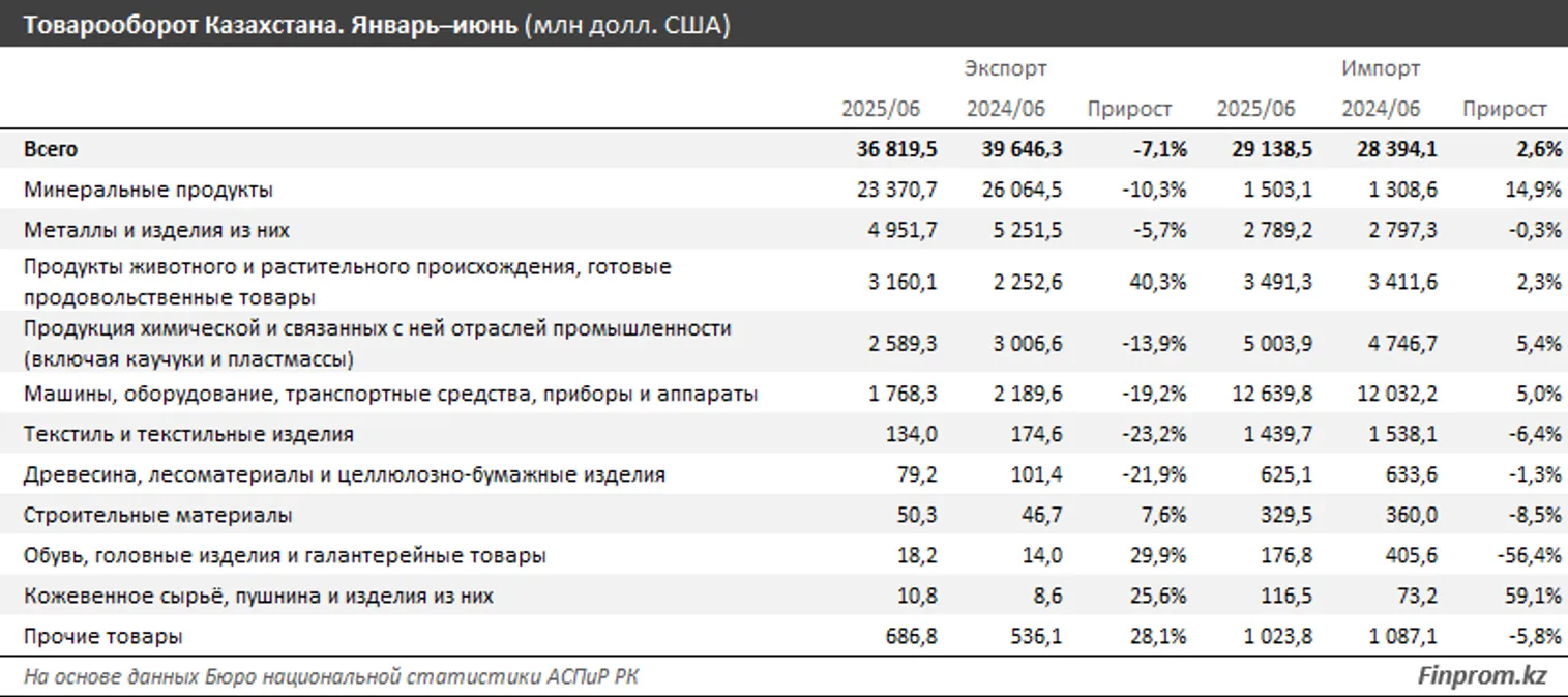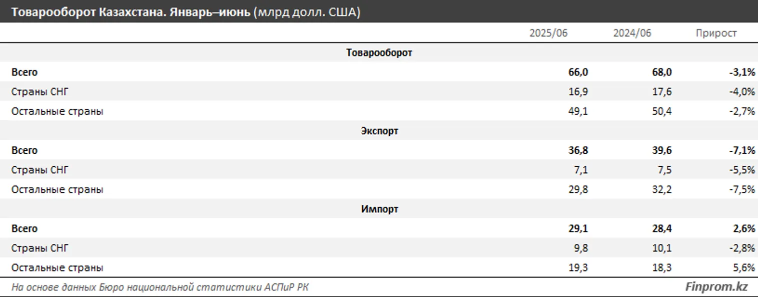 Экспорт из Казахстана составил 36,8 млрд долларов — на 7,1% меньше, чем за январь–июнь 2024-го. Из них 7,1 млрд долларов пришлось на страны СНГ, 29,8 млрд долларов — на остальные страны. В то же время импорт в Казахстан вырос на 2,6%, достигнув 29,1 млрд долларов. В его структуре 9,8 млрд долларов пришлось на страны СНГ, 19,3 млрд долларов — на другие государства.