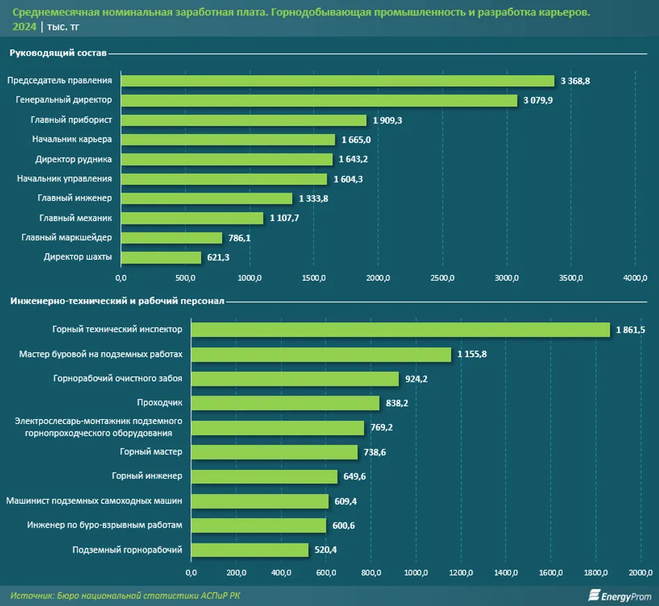 Что касается руководящего состава, номинальная зарплата там намного выше, чем в среднем по сектору. Например, председатель правления крупного горнодобывающего предприятия может получать 3,4 млн тенге, генеральный директор — 3,1 млн тенге, начальник карьера — 1,7 млн тенге.