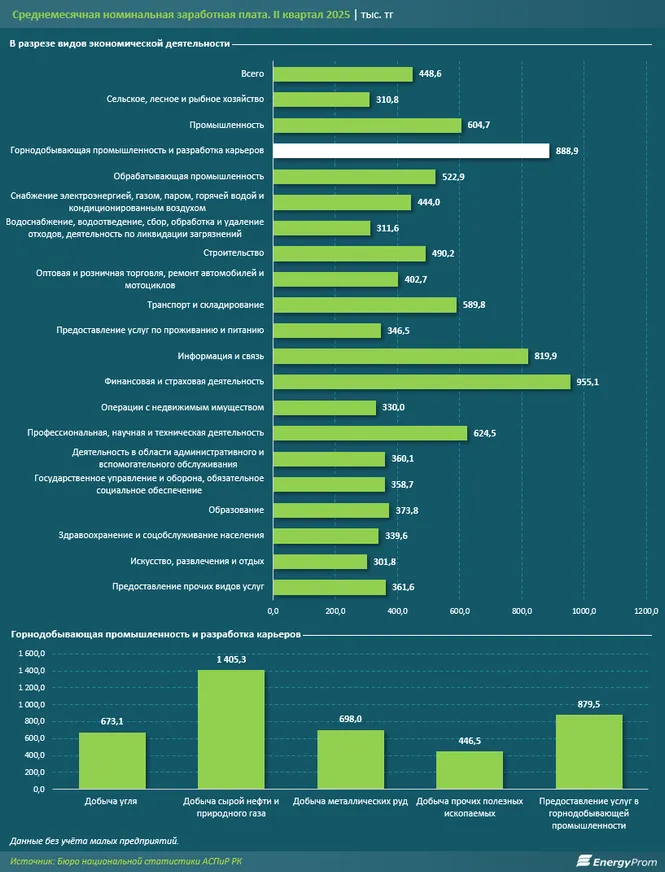 А вот официальные данные Бюро национальной статистики (БНС) АСПиР РК. По информации из отчётов за второй квартал текущего года, средняя номинальная зарплата работника горнодобывающей промышленности составила 888,9 тыс. тенге. В сравнении с остальными отраслями экономики эта категория стоит на втором месте после финансовой сферы по величине номинальной зарплаты.