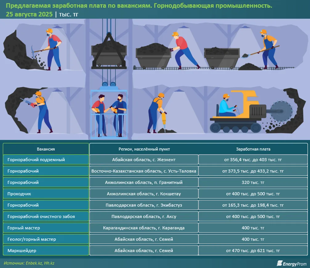 По данным с сайтов государственной электронной биржи труда Enbek.kz и частной рекрутинговой площадки Hh.kz, подземным горнорабочим предлагают вакансии с зарплатой от 165,3 тыс. до 500 тыс. тенге. Сумма зависит от сложности задач, опыта работы кандидата, а также размерности компании-работодателя. Горный мастер, проходчик, судя по опубликованным объявлениям, могут рассчитывать на зарплату от 400 тыс. до 500 тыс. тенге, маркшейдер — от 470 тыс. до 621 тыс. тенге.